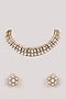 Featuring a gold finish choker necklace studded with cream kundan polki and pearls, set in mixed metal. It is paired with a matching pair of earrings. Perfect for festive occasions, weddings or cultural events, this jewellery is a wardrobe must for those who love to shine effortlessly.