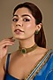 Featuring a gold finish choker necklace studded with emerald green kundan polki, set in mixed metal. It is paired with a matching pair of earrings. Ideal for festive occasions, weddings, or elevating your elegant evening look.