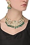This necklace set features a gold finish bridal necklace with kundan and green semi precious stones with green bead drops, set in silver. It comes along with a pair of gold finish flower earrings studded with kundan stones and jhumki drop with green bead drops, set in silver.