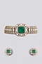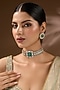 Featuring a gold finish choker necklace studded with kundan polki, pearls and emerald green stone, set in mixed metal. It is paired with a matching pair of earrings. Perfect choice for weddings or other Indian festivities.
