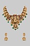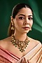 Featuring a gold finish necklace studded with kundan polki and green stone drops, set in mixed metal. It is paired with a matching pair of earrings. Perfect for festive occasions, weddings or cultural events, this jewellery is a wardrobe must for those who love to shine effortlessly.
