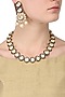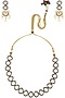 This necklace set features a gold finish necklace with navy enamel detailing around big kundan stones, set in silver. It comes along with a pair of gold finish earrings studded with with navy enamel detailing around kundan stones and pearl drops, set in silver.