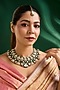 Featuring a gold finish necklace studded with multi-colored kundan polki, set in mixed metal. It is paired with a matching maangtikka. Perfect for festive occasions, weddings or cultural events, this jewellery is a wardrobe must for those who love to shine effortlessly.