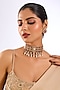 Featuring a gold finish choker necklace studded with kundan polki, pearl drops and ruby red stones, set in mixed metal. It is paired with a matching of statement stud earrings. Perfect wear for festive occasions or wedding ceremony.