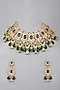 Featuring a 22 Kt gold plated necklace studded with kundan and green stones, set in alloy. It is paired a with matching pair of earrings.