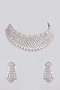 Featuring a silver finish choker necklace studded with crystals, set in mixed metal. It is paired with a matching pair of earrings. Perfect for wedding celebrations, festive soirees or cultural gatherings adding a regal charm to every look.