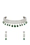Featuring a silver finish choker necklace studded with green semi precious stones and diamonds, set in alloy. It is paired with a matching pair of earrings.