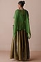 Featuring a green sheer cape crafted from organza fabric, adorned with gota work and resham latkans. It is paired with a chanderi printed skirt and a lycra slip. This ensemble is perfect for festive gatherings or wedding celebrations. Style it with mojaris, silver kadas, and jhumkas to add some glamour to your look.