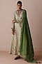 Featuring a green striped anarkali crafted from chanderi fabric, adorned with gota and dori work. It is paired with off-white chanderi pants and a green chanderi dupatta. This ensemble is perfect for festive gatherings or wedding celebrations. Style it with heels and statement jewellery to add some glamour to your look.