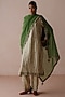 Featuring a green striped kurta crafted from chanderi fabric, adorned with marodi and sequins embroidery. It is paired with matching chanderi pants and a dupatta. This ensemble is perfect for festive gatherings or wedding celebrations. Style it with heels and pearl jewellery to add some glamour to your look.