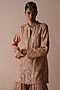 Featuring a rust zigzag kurta crafted from chanderi fabric, adorned with dori embroidery and motifs. It is paired with a matching chanderi sharara and a dupatta. This ensemble is perfect for festive gatherings or wedding celebrations. Style it with heels and pearl jewellery to add some glamour to your look.