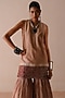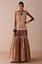 Featuring a rust zigzag handblock printed short kurta crafted from chanderi fabric, adorned with resham, gota, and marodi embroidery. It is paired with a chanderi sharara and a dupatta. This ensemble is perfect for festive gatherings or wedding celebrations. Style it with heels and pearl jewellery to add some glamour to your look.
