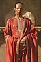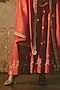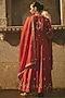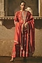 Featuring a rust red anarkali in chanderi base, adorned with kachi patti gota work and dori embroidery. It is paired with churidar and a dupatta. Style it with statement earrings, a cuff, and juttis for a festive occasion, a cultural event or a pooja ceremony.