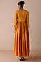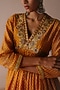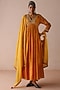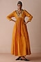 Featuring a yellow anarkali crafted from chanderi fabric, adorned with handblock print, thread and dabka embroidery. It is paired with a chanderi printed dupatta having motif detailing. This ensemble is perfect for festive gatherings or wedding celebrations. Style it with mojaris, silver kadas, and jhumkas to add some glamour to your look.