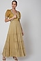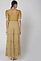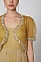 Featuring a yellow layered jumpsuit in georgette base. It is paired with a matching organza jacket, a belt, and bag.