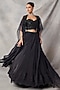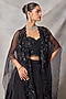 Featuring a black cape in organza and net base. It is paired with a flared skirt and an embroidered bustier. Accentuate it with polki stud earrings and block heels for weddings or sangeet ceremonies.
