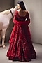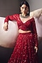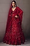 Featuring a blood red lehenga in net and organza base with embroidery. It is paired with an embroidered blouse, a cancan and a dupatta. Accentuate it with statement jewellery and heels for a sangeet ceremony.