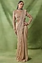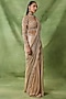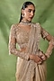Featuring a champagne pre-draped saree in chiffon and organza base with floral embroidery. It is paired with an embroidered blouse. Accentuate it with polki or pearl jewellery and block heels for festive occasions, wedding or sangeet ceremony.