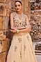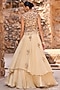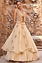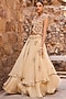 Featuring a champagne layered lehenga in organza base. It is paired with a bustier having metal beads embroidery and a short jacket. Accentuate it with silver jewellery and heels for a sangeet or wedding ceremony.