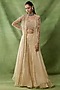 Featuring a champagne cape in organza net base with embroidery. It is paired with an embroidered bustier and sharara pants. Accentuate it with zircon jewellery and block heels for festive occasions, wedding or sangeet ceremony.