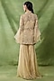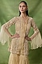 Featuring a champagne peplum in organza net base with embroidery and frilled sleeves. It is paired with sharara pants and a dupatta. Accentuate it with zircon or pearl jewellery and block heels for a wedding or sangeet ceremony.