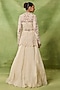 Featuring an ivory lehenga in organza and net base with boota embroidery. It is paired with a peplum top and an organza frilled dupatta. Accentuate it with polki stud earrings and block heels for weddings or engagement ceremonies.