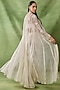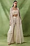 Featuring an ivory cape in organza and net base with embroidery. It is paired with an embroidered bustier and pants. Accentuate it with emerald jewellery and block heels for a wedding or sangeet ceremony.