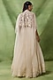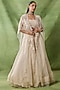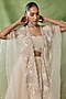 Featuring an ivory cape in organza net base with embroidery. It is paired with an embroidered bustier and a flared skirt. Accentuate it with zircon jewellery and block heels for a wedding or sangeet ceremony.