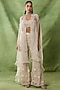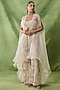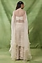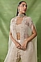Featuring an ivory long cape in organza net base with floral embroidery. It is paired with an embroidered bustier and embroidered pants. Accentuate it with zircon jewellery and block heels for festive occasions, wedding or sangeet ceremony.