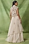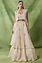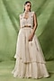 Featuring an ivory short jacket in organza net base with embroidery. It is paired with an embroidered bustier and a ruffled layered skirt. Accentuate it with zircon jewellery and block heels for a wedding or sangeet ceremony.