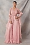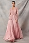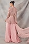 Featuring a pink peplum top in organza and net base with embroidery. It is paired with boota embroidered sharara pants and a frilled dupatta. Accentuate it with polki stud earrings and block heels for weddings or engagement ceremonies.