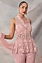 Featuring a pink peplum top in organza and net base with embroidery. It is paired with pants and a frilled dupatta. Accentuate it with polki stud earrings and block heels for weddings or engagement ceremonies.
