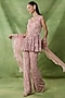 Featuring a pink peplum in organza net base with embroidery. It is paired with pants and an organza dupatta. Accentuate it with zircon or pearl jewellery and block heels for a wedding or sangeet ceremony.