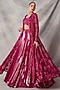 Featuring a red jacket in organza and net base with embroidery. It is paired with a skirt and a bustier. Accentuate it with polki stud earrings and block heels for weddings or sangeet ceremonies.