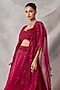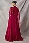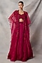 Featuring a red lehenga in organza and net base with floral embroidery. It is paired with an embroidered blouse and a cape. Accentuate it with polki stud earrings and block heels for weddings or sangeet ceremonies.