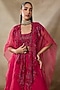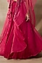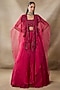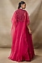 Featuring a red cape in organza and net base with embroidery. It is paired with an embroidered bustier and a skirt. Accentuate it with swarovski or zircon jewellery and embellished heels for a wedding, sangeet or engagement ceremony.