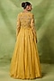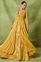 Featuring a yellow jacket in organza and net base with three dimensional bead embroidery. It is paired with a sequin skirt and an embroidered bustier. Accentuate it with polki stud earrings and block heels for weddings or haldi ceremonies.