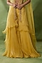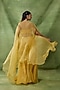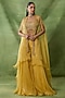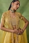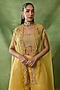 Featuring a yellow cape in organza and net base with embroidery. It is paired with an embroidered bustier and sharara pants having belt detail. Accentuate it with zircon or swarovski jewellery and embellished heels for a sangeet, haldi or cocktail ceremony.