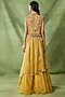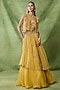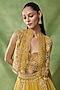Featuring a yellow short jacket in organza net base with embroidery. It is paired with an embroidered bustier and a ruffled layered skirt. Accentuate it with polki jewellery and block heels for a wedding or haldi ceremony.