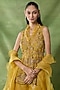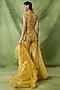 Featuring a yellow peplum in organza net base with embroidery. It is paired with sharara pants and a dupatta. Accentuate it with zircon jewellery and block heels for a wedding or haldi ceremony.