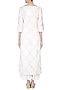 This set features an ecru long straight kurta in chanderi base with mughal botanic hand embroidered motifs along with gold gota patti lace detailing on the front and back. It is paired with matching cotton sharara pants. It comes along with an ecru color georgette dupatta with mukaish wotk all over and gold gota patti tassel hangings at the corners.