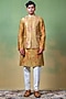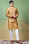 Featuring a green bundi jacket in raw silk base with floral, zardosi and thread embroidery. It is paired with a chanderi kurta. Style it with pants and kolhapuri sandals for a festive occasion, summer wedding, mehendi for engagement ceremony.