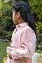 Featuring a pink shirt for girls in silk base with puffed sleeves, including 3D floral and thread work. It is paired with cotton satin pants and a belted bag. Accessorize this set with hair accessories and sandals for a stylish ensemble, ideal for any festive occasion or vacation.