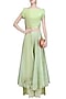 This set features a green crop top in velvet base with petal sleeves and sequins embroidered neckline. It is paired with matching green tassar silk pleated double layered sharara with gold pearl bootis scattered around the hem. It comes along with green net embroidered dupatta.