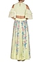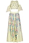 Featuring a light green cold shoulder crop top in georgette base with nakshi and thread work hand embroidery. It is paired with a matching sharara pants in chanderi base having hand painting.