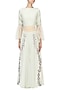 This set features a mint green top in chanderi and net base with floral thread work on the front with embellished back and pearl lace detailing. It is paired with matching mint green handpainted pants.