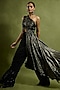 Featuring a black and gold one shoulder draped jumpsuit in crinkled metallic lame base with sequins, cut-pipes and bead hand embellishments, including high-low drape. Accentuate it with statement earrings and heels for an evening wear.