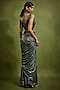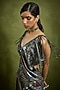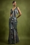 Featuring a black ruffled draped saree in holographic georgette base. It is paired with a v-neck blouse having beaded fringe sleeves. Accentuate it with statement jewellery and heels for wedding or cocktail ceremonies.