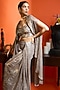 Featuring a champagne gold asymmetric cape in wrinkled shimmer georgette base with sequins embellishments. It is paired with a hand embroidered bralette and a draped skirt. Style it with sculpted ear cuffs, block heels and a sleek braided pony for a cocktail or sangeet ceremony.