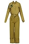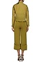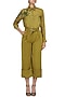 Featuring a chartreuse green shirt in silk base with intricate embroidery and mesh detailing on the shoulder. It is paired with chartreuse green wide legged pants in wool crepe base.